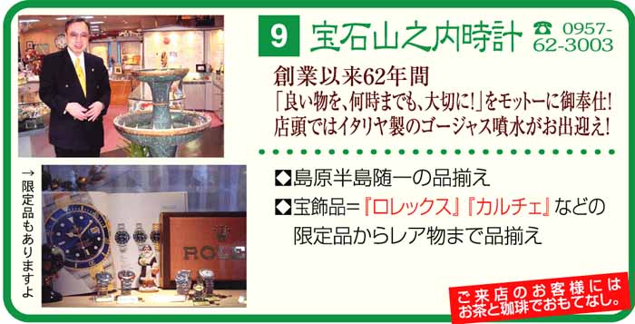 世界の一流品 カルティエ (時計メガネ共、取り扱っているのは長崎県では当店のみです。)、 ロレックス、ボームメルシー、グッチ、 タグホイヤー、フィリップシャリオール、 クィーンジュェリー、トレベール、ニナリッチ、 ブルーリバー、サンローラン、ウノアエレ、コーチ、他 若い方向きには、 アニエスベー、レノマ、クレージュ、ケンゾー、 セイコー、シチズン、他