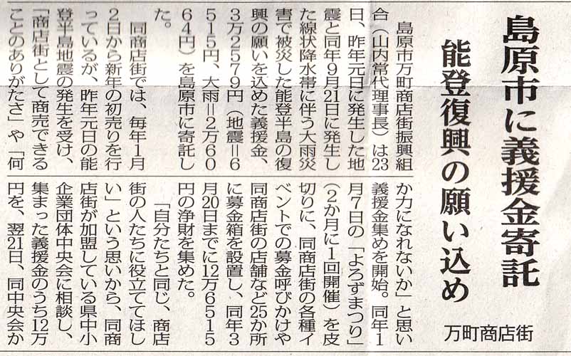 能登半島地震災害義援金募金![]() ご協力ありがとうございます ご金額 126,493円 3月21日長崎県商店街振興組合連合会へお渡ししました |