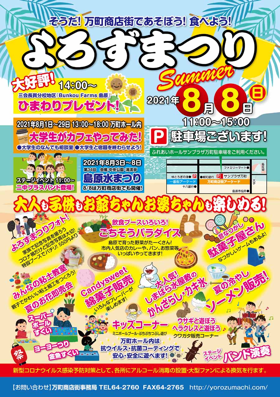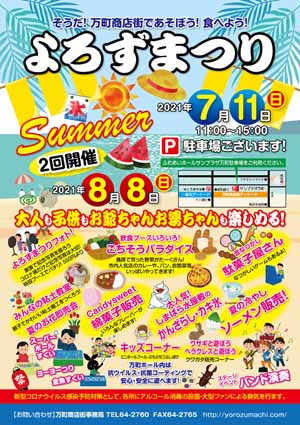 | 夏の味覚“ごちそうパラダイス”、 ステージイベント、縁日ゲーム、たくさんのショップが並びます! 大人も子供もお爺ちゃんお婆ちゃんも楽しめる! そうだ!万町商店街で遊ぼう! |
