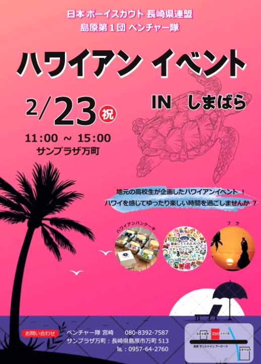 | 日本ボーイスカウト 長崎県連盟 島原第一団 ベンチャー隊 ハワイアンイベント IN しまばら 2/23(木・祝)11:00〜15:00 サンプラザ万町(長崎県島原市万町513) http://www.yorozumachi.com/ ◎フラダンスステージ ◎ハワイアンフード&ドリンク販売 ◎ハワイフォトスポット紹介 等など ボーイスカウト島原第一団 https://www.facebook.com/100064561097748 |