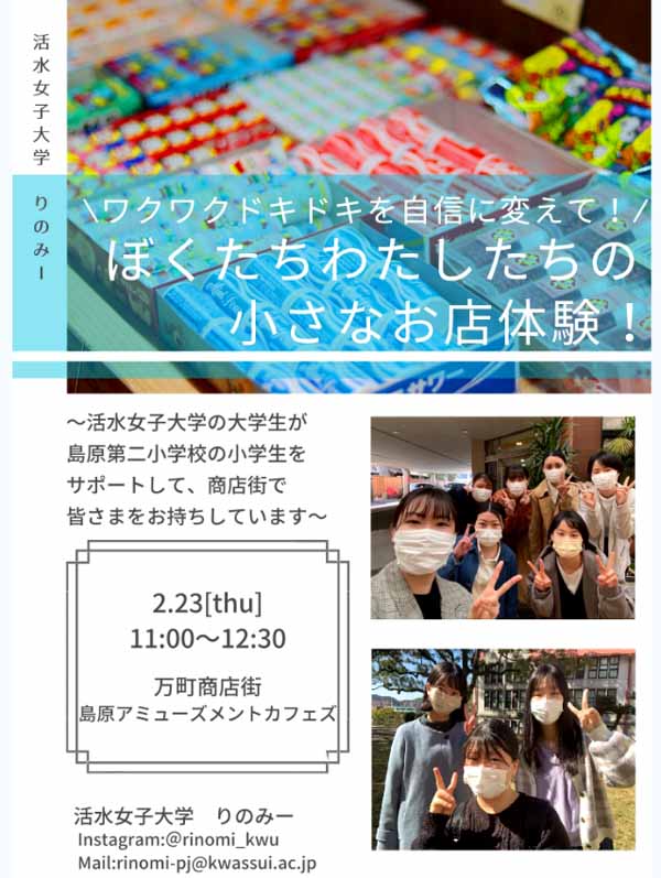 | ☆ワクワクドキドキを自信に変えて! ぼくたちわたしたちの小さなお店体験 11:00〜12:30 島原アミューズメントカフェズ前 (島原市万町508) 島二小学生&活水女子大生の駄菓子屋さん♪ 活水女子大学:りのみープロジェクト https://www.instagram.com/rinomi__kwu/ https://www.kwassui.ac.jp/university/kouken/chiikirenkei.html |