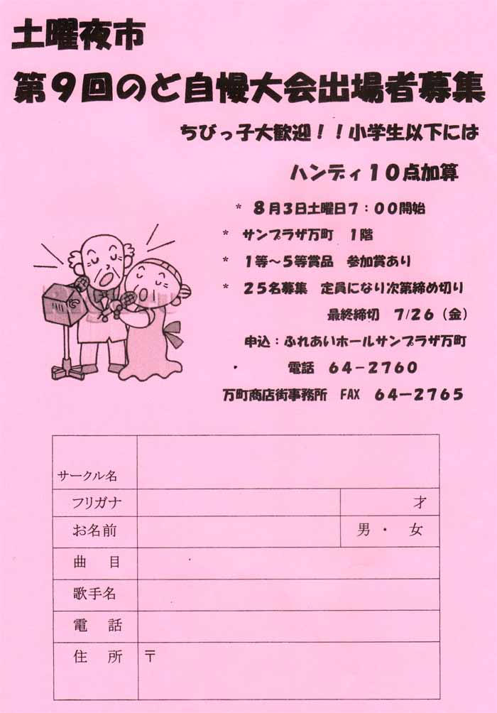 | “y—j–és@ƒtƒŠ[ƒ}[ƒPƒbƒg 7/20i“yjE7/27i“yjE8/3i“yjE8/10i“yj pm6`9@ƒTƒ“ƒvƒ‰ƒU–œ’¬ƒz[ƒ‹@Q‰Á”ïF500‰~i2m~2mj \æF–œ’¬––±Š@0957-64-2760@@•åW’÷‚ߨ‚èF7/26i‹àj |