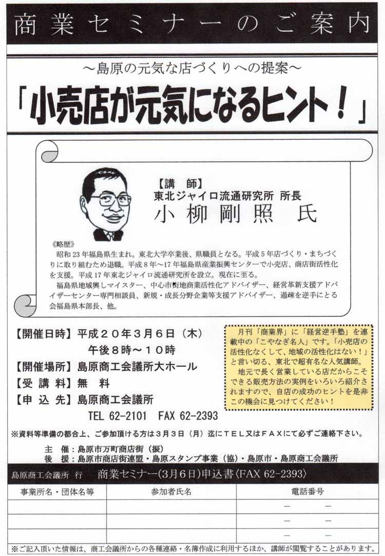 | 20080122 佐賀県商工会連合会「経営セミナー」 こやなぎ名人(福島) ![]() ↑クリックどうぞ↑ |