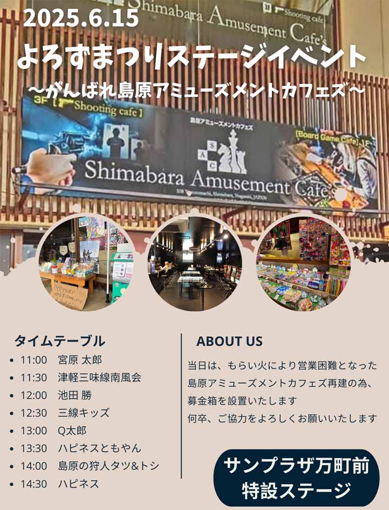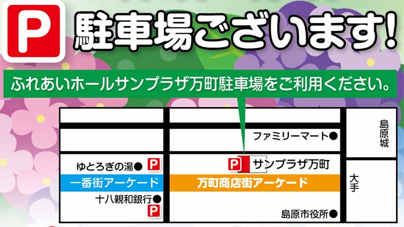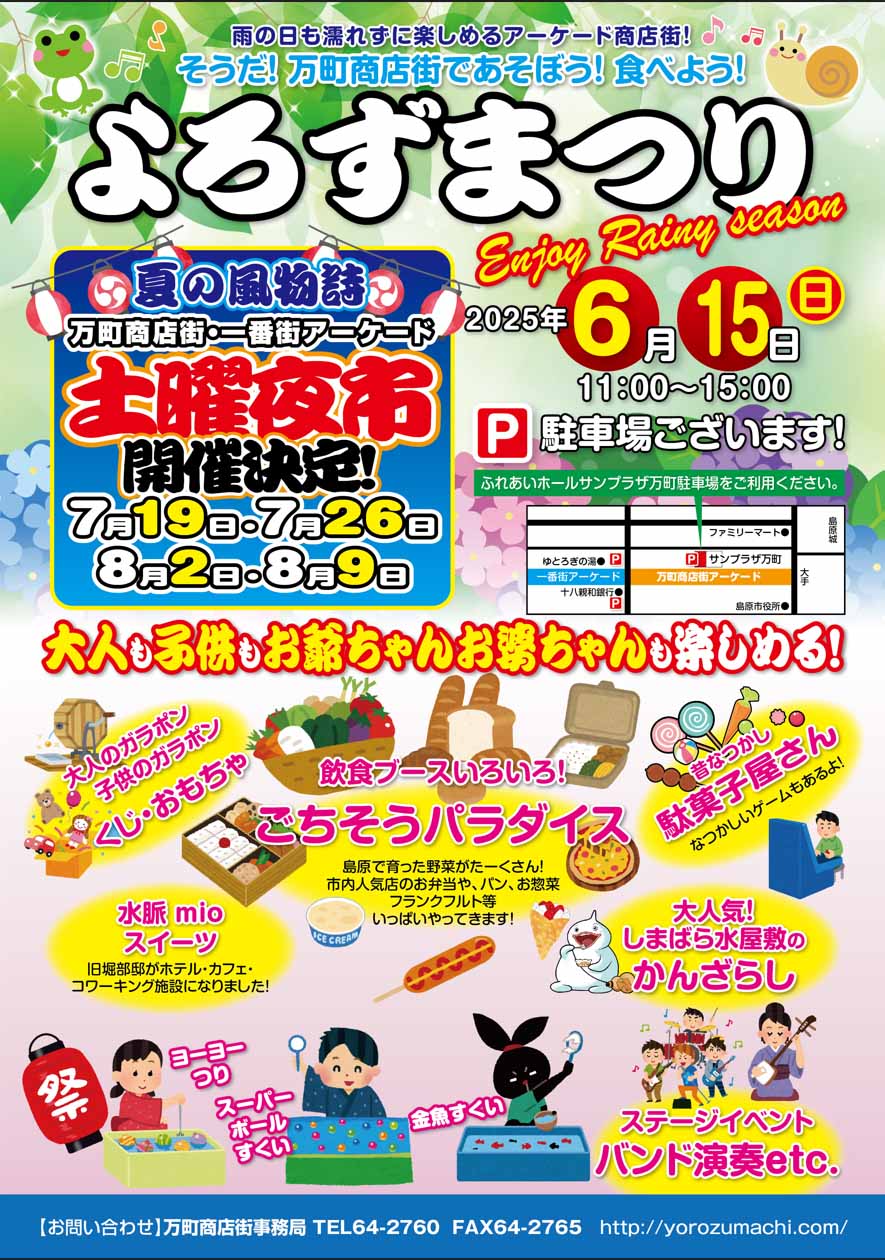 | 島原の味覚“ごちそうパラダイス”、 ステージイベント、縁日ゲーム、たくさんのショップが並びます! 大人も子供もお爺ちゃんお婆ちゃんも楽しめる! そうだ!万町商店街で遊ぼう! |